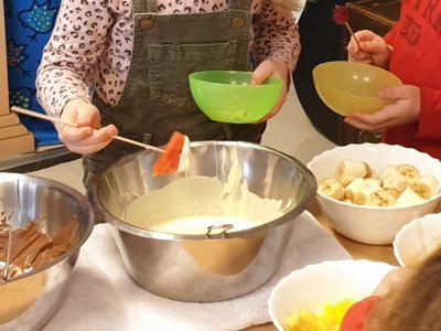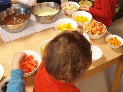 Es stellte sich die Frage, was man aus dem Obst und Gemüse herstellen bzw. was man davon verzehren kann. Die Kinder haben aus unterschiedlichen Zutaten Tomatenketchup selber zubereitet oder einen Apfelkuchen gebacken. Die Äpfel wurden im Vorwege auf dem Markt in Bad Schwartau von den Kindern ausgesucht. Das Highlight war die Kombination von Obst mit Schokolade. Wir probierten, wie die unterschiedlichen Obstsorten mit Schokolade schmecken („Schokobrunnen“).