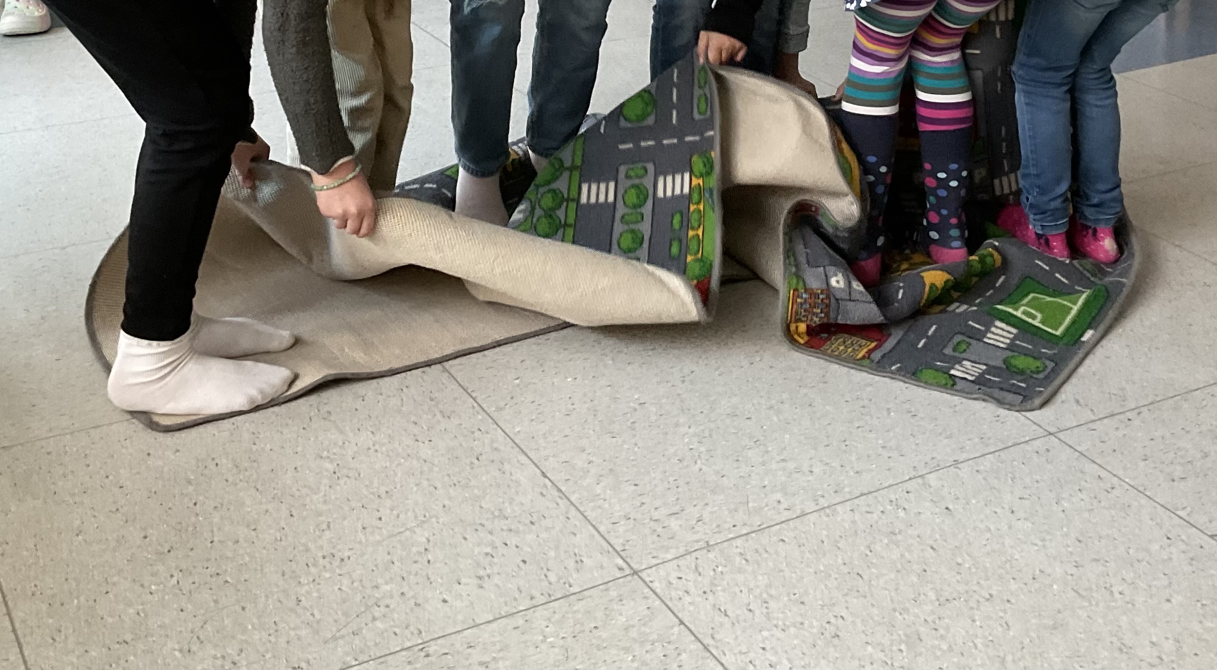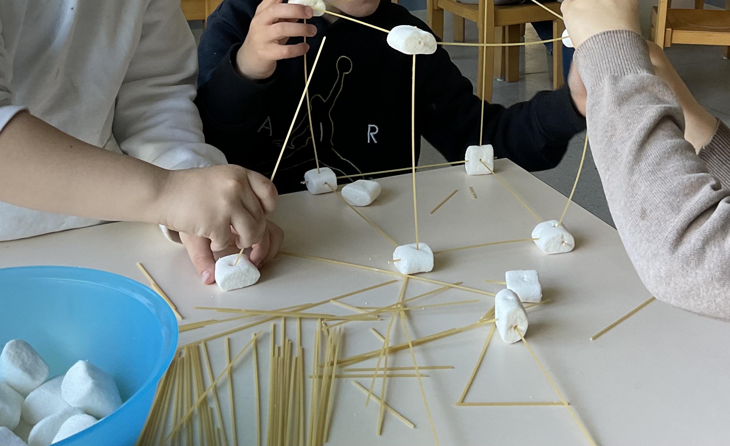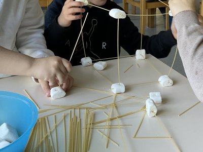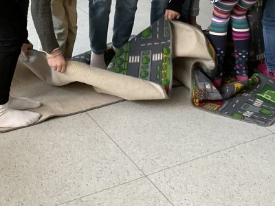 • Wir machten  Astronautentraining und haben dafür Kooperationsspiele gemacht z.B. „Das Blatt wenden“, bei dem die Gruppe auf einem Teppich steht und diesen dann wenden soll, ohne den Teppich zu verlassen oder den Boden zu berühren. Aber auch Einzeltraining der Feinmotorik (mit einer Pinzette und Handschuhen Erbsen in die Fächer eines Eierkartons sortieren) und des Gleichgewichtes (10 mal auf der Drehscheibe schnell drehen und dann einen mit Wasser gefüllten Becher transportieren) haben die Kinder absolviert. Eine besondere Herausforderung war für die Kinder die Aufgabe, im Kleinteam aus rohen Spaghetti und Marshmallows einen Turm zu bauen.