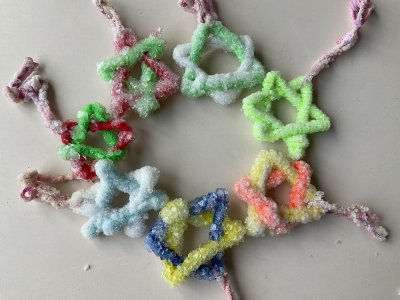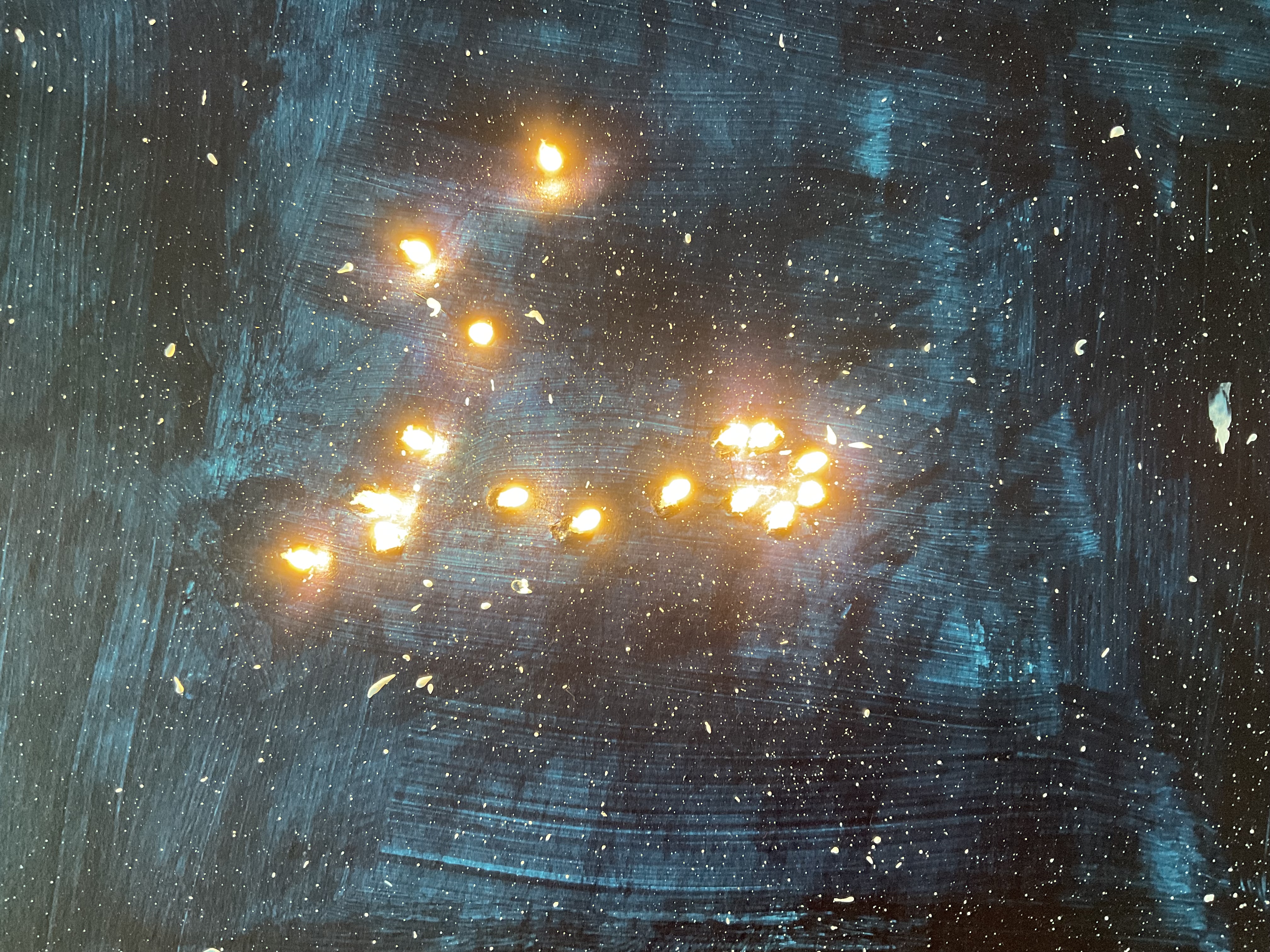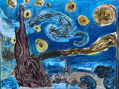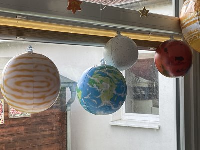 • Kreativ haben wir das Thema aufgegriffen, indem die Kinder das Bild „Sternnennacht“ von Vincent van Gogh als Fensterbild gemalt haben und aus Salzteig Sterne zum Aufhängen hergestellt und gestaltet haben. Außerdem haben die Kinder zu dem Lied „Major Tom-Völlig losgelöst“ von Peter Schilling eigenständig einen Tanz choreografiert und ein Video gedreht. Einige Kinder haben aus einem Karton und einer Lichterkette ein Nachtlicht aus dem Sternenbild ihres Sternzeichens gebaut und nachdem wir Amerikaner gebacken haben, bauten sich die Kinder daraus mit Schokoküssen, Gummibärchen, Lebensmittelfarbe und jeder Menge Zuckerguss  Ufos.