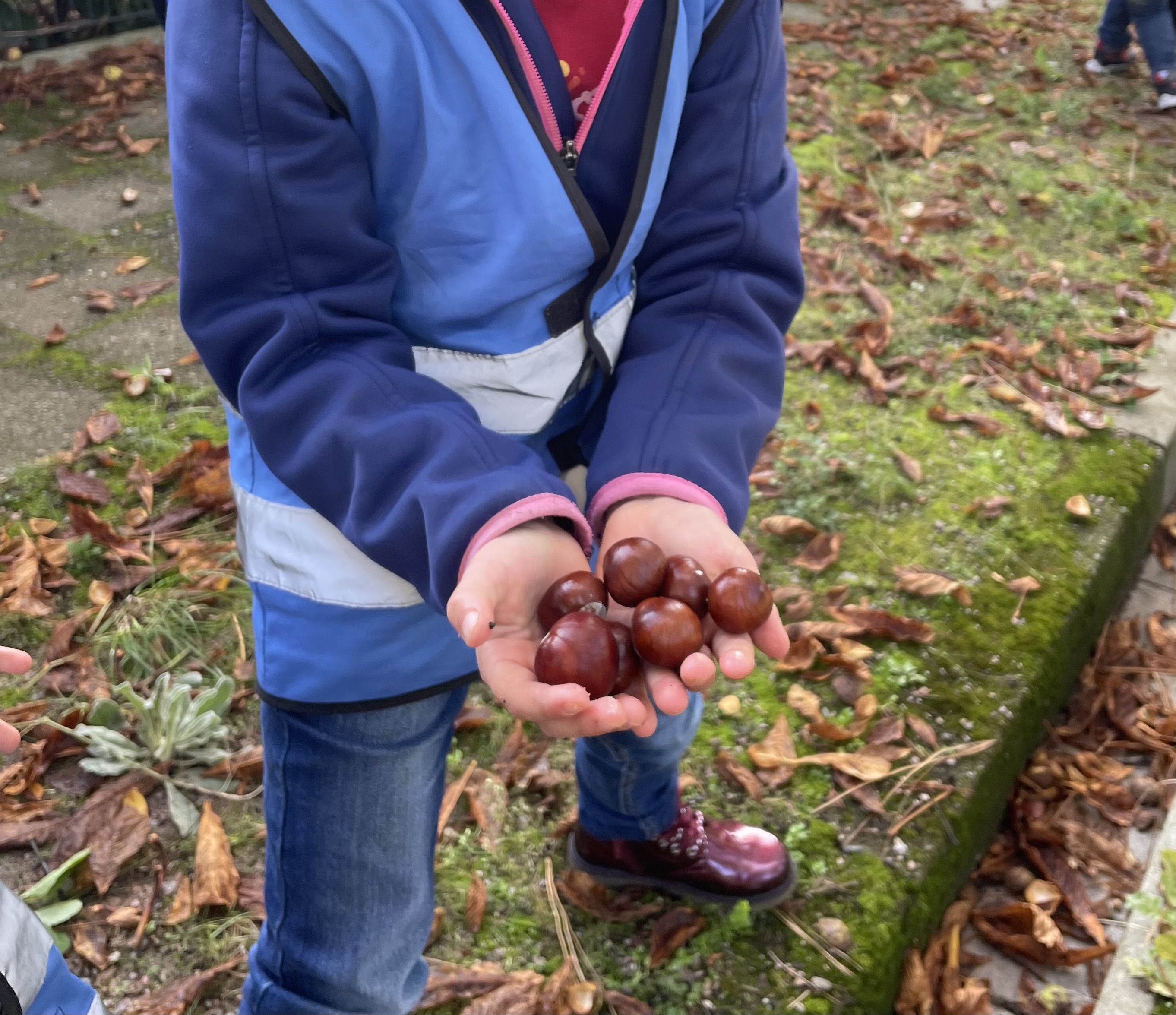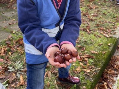 So auch in der Hundegruppe. Wir haben viele schöne Dinge in der Natur entdeckt. Zum Beispiel bunte Blätter, Eicheln und Kastanien.