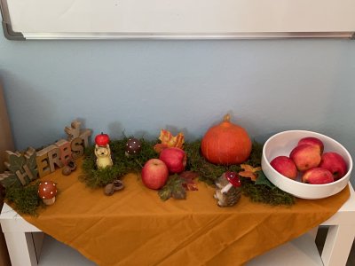 Unser Jahreszeitentisch erstrahlt in den schönen herbstlichen Farben und jeder Menge gesammelter Naturmaterialien.